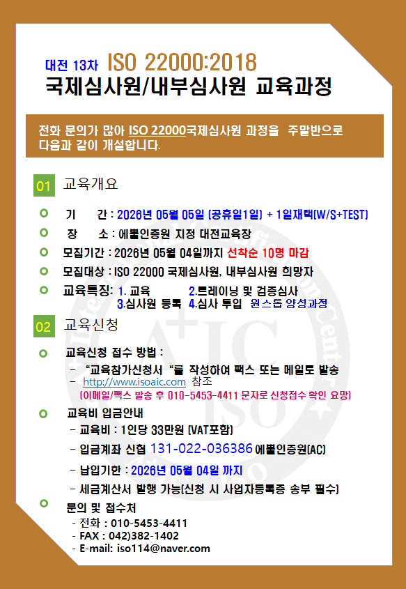 1. ±³À°¸í : ´ëÀü 13Â÷ ÁÖ¸»¹Ý ISO 22000 ±¹Á¦¼±ÀÓ½É»ç¿ø °úÁ¤