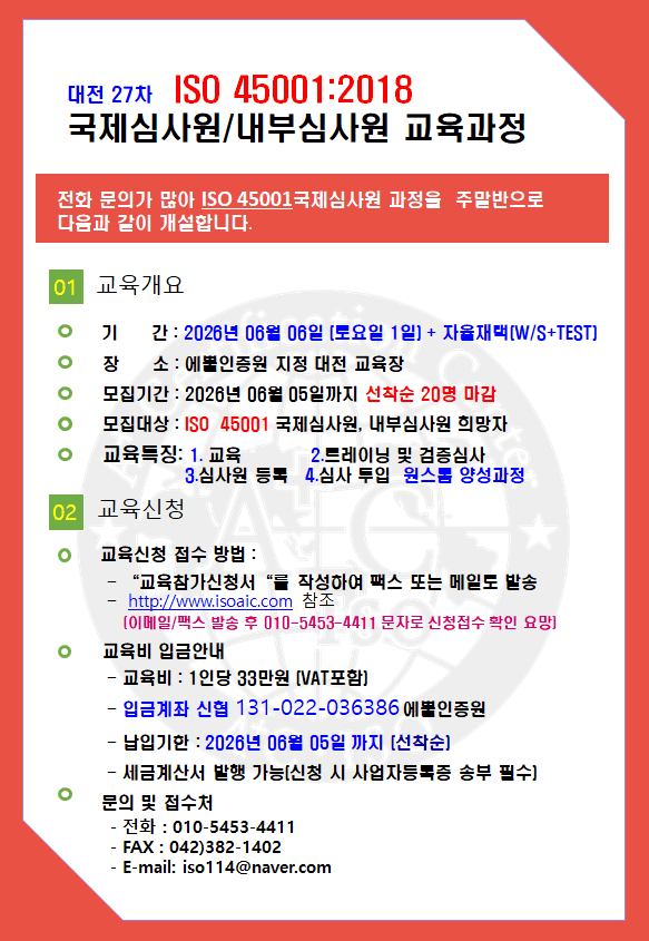 ´ëÀü 27Â÷ ÁÖ¸»¹Ý ISO 45001 ±¹Á¦¼±ÀÓ½É»ç¿ø °úÁ¤(06/06)