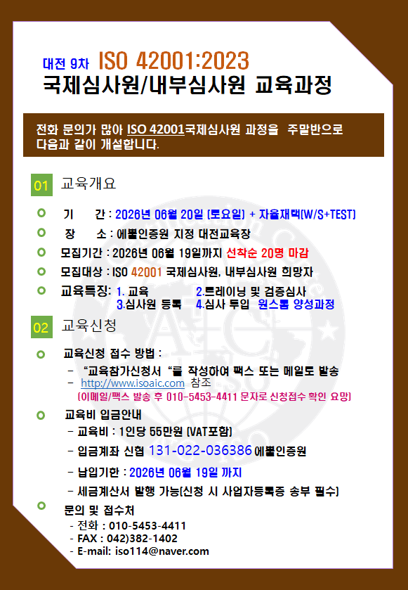 - Ai¸ðµâ(ISO 42001) 1ÀÏÂ÷ 2026³â 06¿ù 20ÀÏ 09:00~16:30 (´ë¸éÁýÇÕ±³À°)