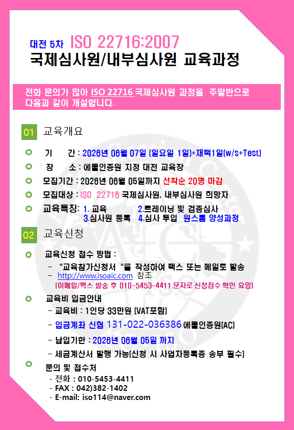 ps: 2023³â/2024³â ÀüÈ·Î ISO 9001, ISO 14001, ISO 22000, ISO 13485, ISO 37001/37301, ISO 45001 ±¹Á¦¼±ÀÓ½É»ç¿ø °úÁ¤¿¡ ´ëÇÑ ¹®ÀÇ ³»¿ë Á¤¸®