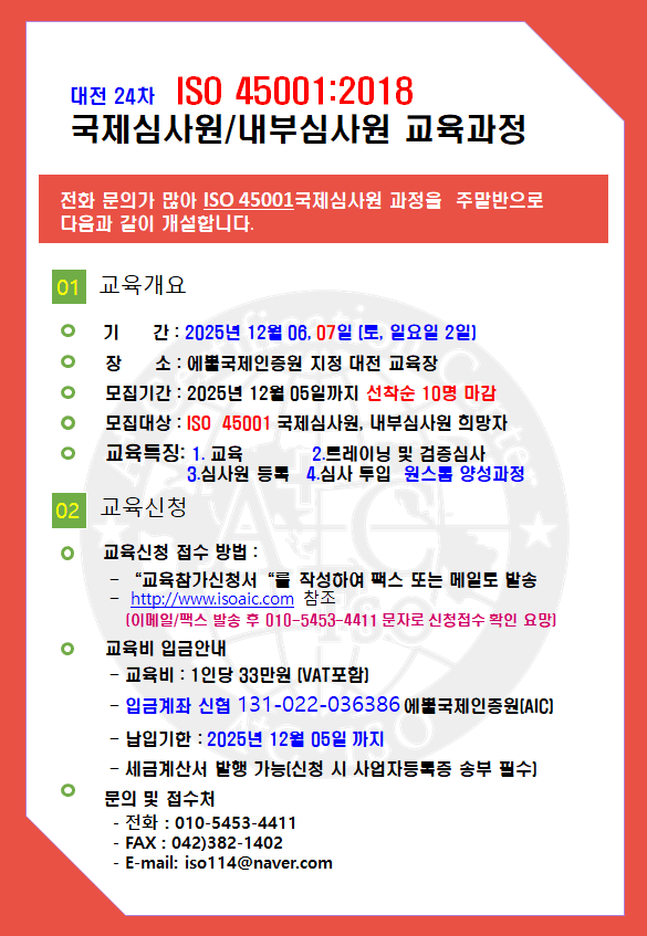 1. ±³À°¸í : ´ëÀü 24Â÷ ÁÖ¸»¹Ý ISO 45001 ±¹Á¦¼±ÀÓ½É»ç¿ø °úÁ¤
