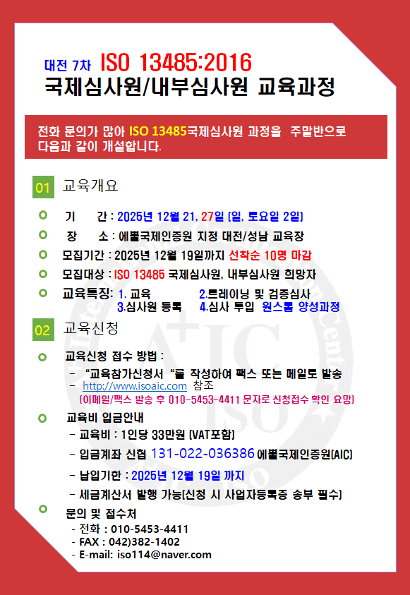 ´ëÀü7Â÷ ÁÖ¸»¹Ý ISO 13485 ±¹Á¦¼±ÀÓ½É»ç¿ø °úÁ¤(12/21, 27)