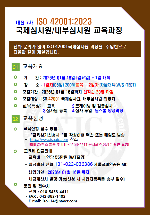 1. ±³À°¸í : ´ëÀü7Â÷ ÁÖ¸»¹Ý ISO 42001 ±¹Á¦¼±ÀÓ½É»ç¿ø °úÁ¤