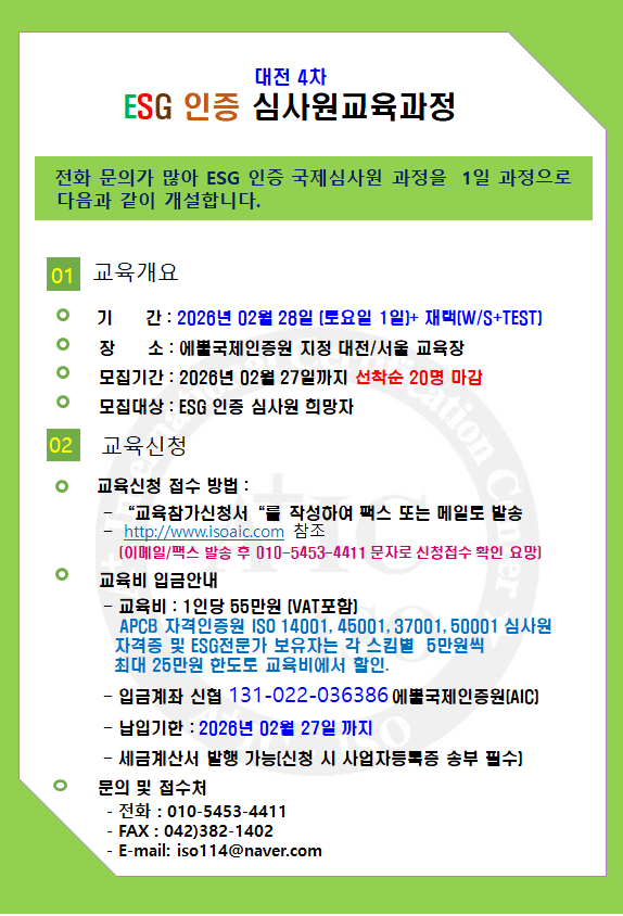 1. ±³À°¸í : ´ëÀü4Â÷ ÁÖ¸»¹Ý ESG ÀÎÁõ ±¹Á¦½É»ç¿ø °úÁ¤_IWA 48:2024