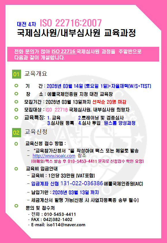 ps: 2023³â/2024³â ÀüÈ·Î ISO 9001, ISO 14001, ISO 22000, ISO 13485, ISO 37001/37301, ISO 45001 ±¹Á¦¼±ÀÓ½É»ç¿ø °úÁ¤¿¡ ´ëÇÑ ¹®ÀÇ ³»¿ë Á¤¸®
