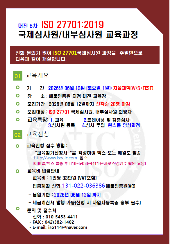 ps: 2023³â/2024³â ÀüÈ·Î ISO 9001, ISO 14001, ISO 22000, ISO 13485, ISO 37001/37301, ISO 45001 ±¹Á¦¼±ÀÓ½É»ç¿ø °úÁ¤¿¡ ´ëÇÑ ¹®ÀÇ ³»¿ë Á¤¸®